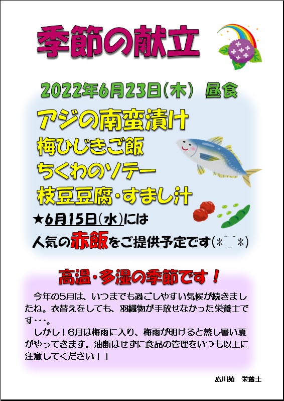 6月は、じめじめした季節にピッタリ。さっぱりとした味付けで旬のアジを使った南蛮漬けと、カリカリとした触感を楽しめる梅ひじきご飯、今が旬の枝豆を使った枝豆豆腐を23日木曜日にご提供させていただきます。