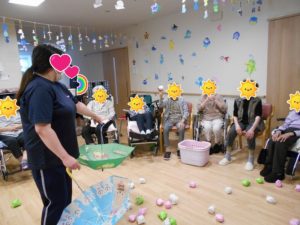 各フロア、それぞれに利用者様に楽しんで頂きながら、手指や腕、足等の筋力維持向上を目的にレクリエーションを行っています。