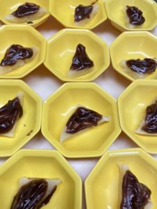 本館3階と新館は栄養士が作った、京の和菓子「水無月」です。一般のレシピ通りだと噛む力、飲み込む力が低下している利用者様には誤嚥の可能性があるため、あんこ(小豆)はペースト状に、白い部分も喉通りが良いように仕上げています。