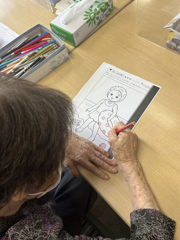 本日は、塗り絵や、文字をなぞり、手先を使いながら、脳ミソトレーニングを行いました💕