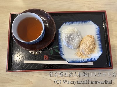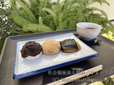 丸めたお餅は、あんこ、きな粉、醤油で味付け。